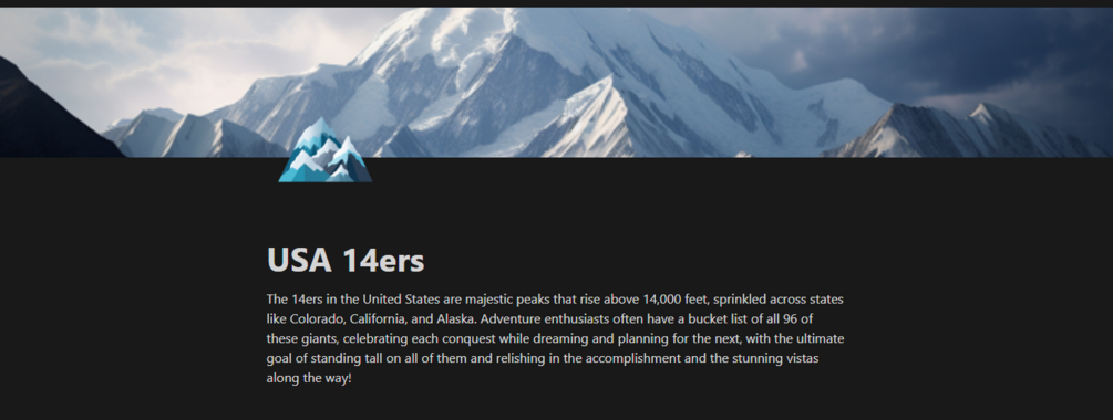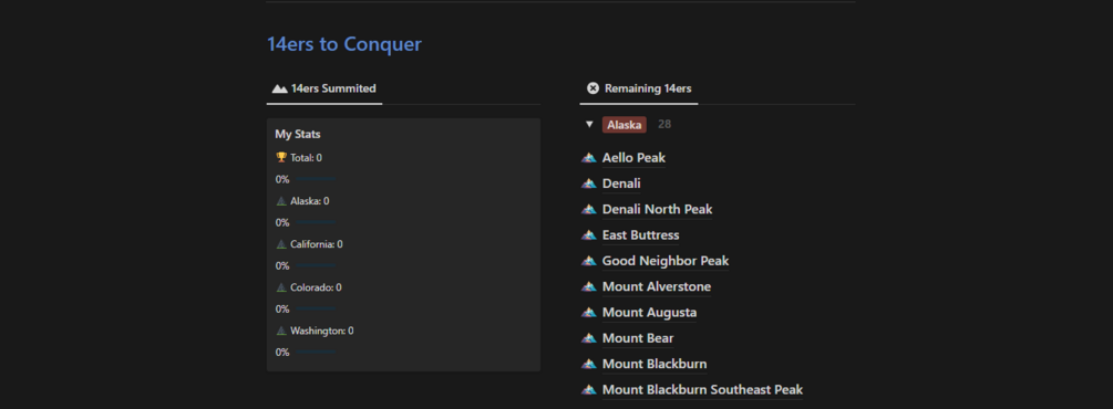 Alaska 14ers Summit ListSleek Notion Template for checking off and conquering USA 14ers, recording hikes, and viewing hiking statistics.